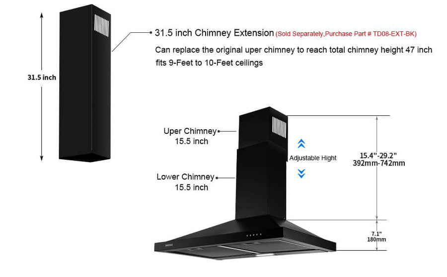 If you have higher ceiling, we have optional 31.5 inch chimney extension, to connect with the original lower chimney to reach total chimney height 47 inch, for 9-Feet to 10-Feet ceilings (Sold Separately, Purchase Part # TD08-EXT-BK).