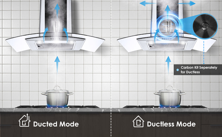 This vent hood also can be converted to re-circulation (ductless) mode with carbon filter(sold separately). After purified by the carbon filter, the clean air will be released back into the kitchen.